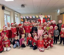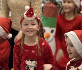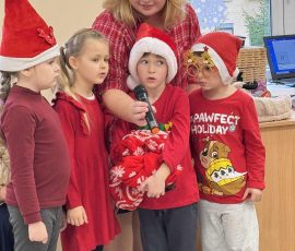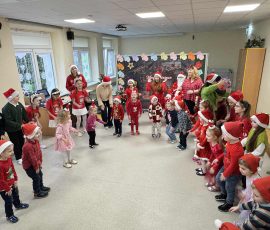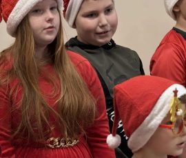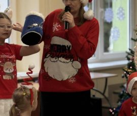 Nie zabrakło również licznych zabaw integracyjnych, w których wszyscy z radością brali udział, szczególnie gdy do wspólnej zabawy dołączył sam Mikołaj. Kulminacyjnym momentem spotkania było wręczenie prezentów, które wywołało wiele uśmiechów i pozytywnych emocji.